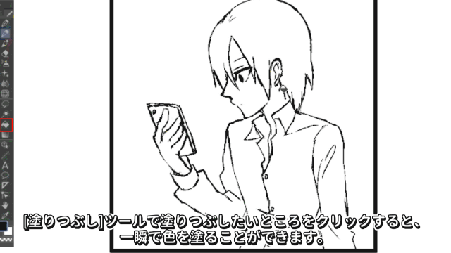 Al hacer clic en el área que deseas rellenar con la herramienta [Relleno],puedes aplicar color al instante.¡Los negros, que en analógico requerían mucho cuidado con los desbordamientos y las irregularidades del color,ahora son tan fáciles!Debido a que el lineart en la parte superior de la cabeza estaba roto,el relleno se desbordó.Si el lineart está roto, añade líneas con el lápizpara evitar desbordamientos antes de rellenar.Luego, puedes añadir más negros con el lápiz odibujar brillos en el cabello con el color de dibujo blanco para finalizar.