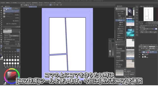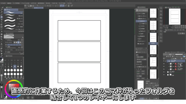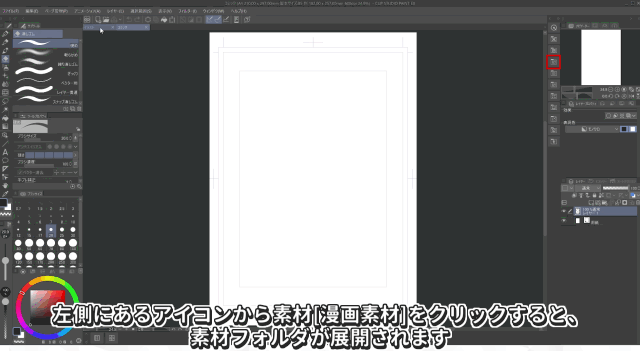 Al hacer clic en el icono [Materiales de manga] del lado izquierdo,se abrirá la carpeta de materiales.Aquí hay varias plantillas de viñetas registradas con diferentes formas.Esta vez, seleccionaremos un material simple de 3 viñetas.Al hacer clic en el icono situado aproximadamente en el centro de la barra de paletas, en la parte inferior de la paleta de materiales,podrás pegar el material en el centro del lienzo.