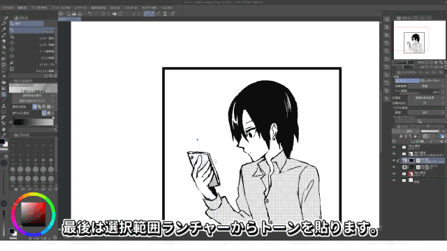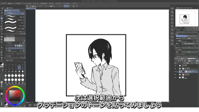 A continuación, vamos a aplicaruna trama de gradiente a partir de una selección.Desde [Selección automática], selecciona la subherramienta [Seleccionar por referencia a otras capas]y haz clic en la parte donde quieras crear la selección.Desde [Degradado], selecciona la subherramienta [Degradado para manga]y arrástrala.Se ha aplicado una trama con un gradiente más oscuro en la parte inferior.Si quieres ajustar la intensidad del gradiente,hazlo con la herramienta [Objeto].
