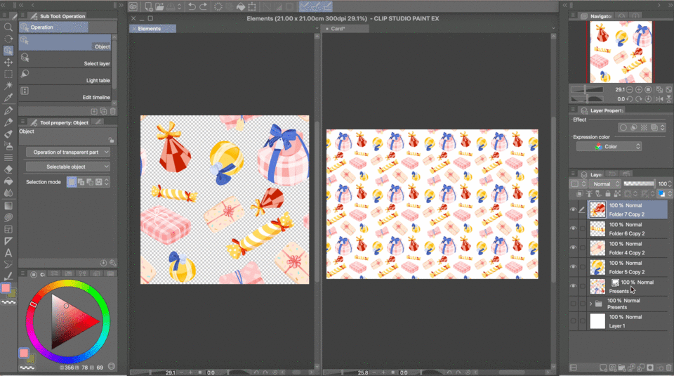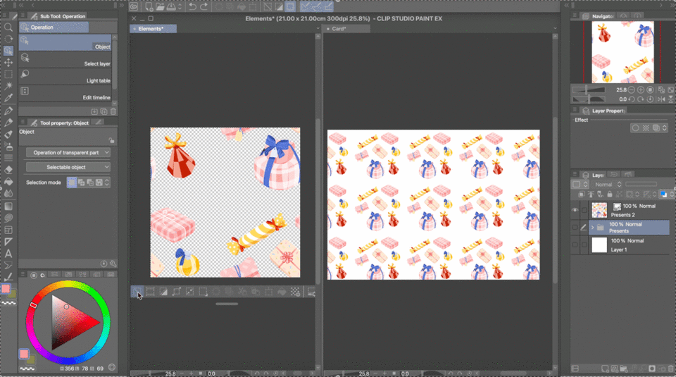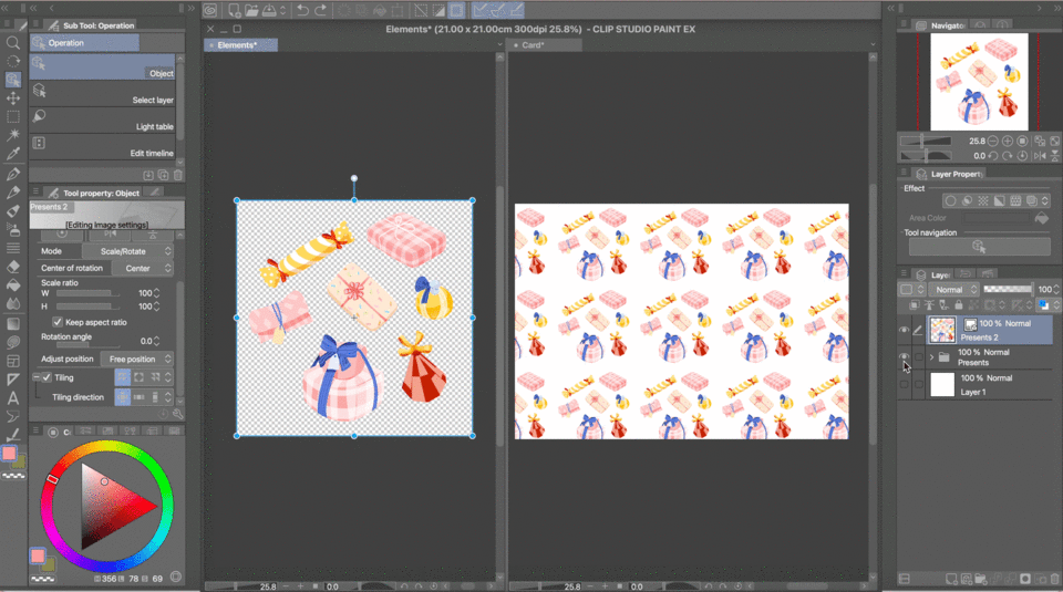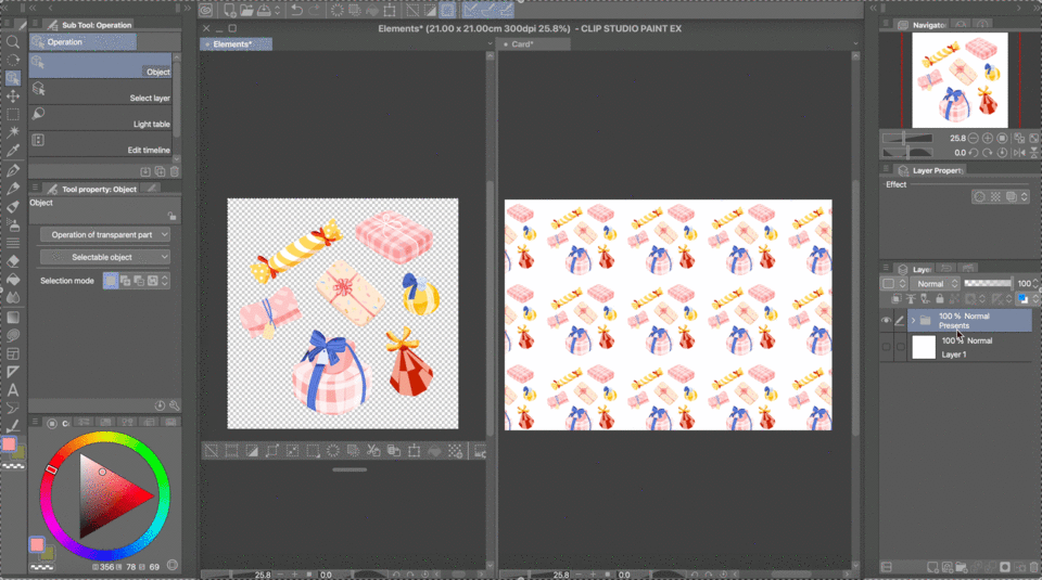 Au final, j'ai séparé chaque cadeau dans son propre calque (ou son propre dossier de calques, si vous n'êtes pas adepte de la fusion des calques de peinture pour chacun) et je les ai organisés proprement autour du centre du canevas, en changeant les tailles et les positions comme bon me semblait. À ce stade, assurez-vous que rien ne touche les bords de votre canevas !