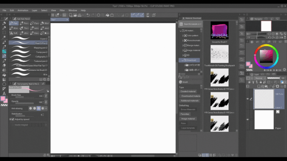Une fois le téléchargement terminé, ouvrez Clip Studio PAINT, et allez dans les matériaux.