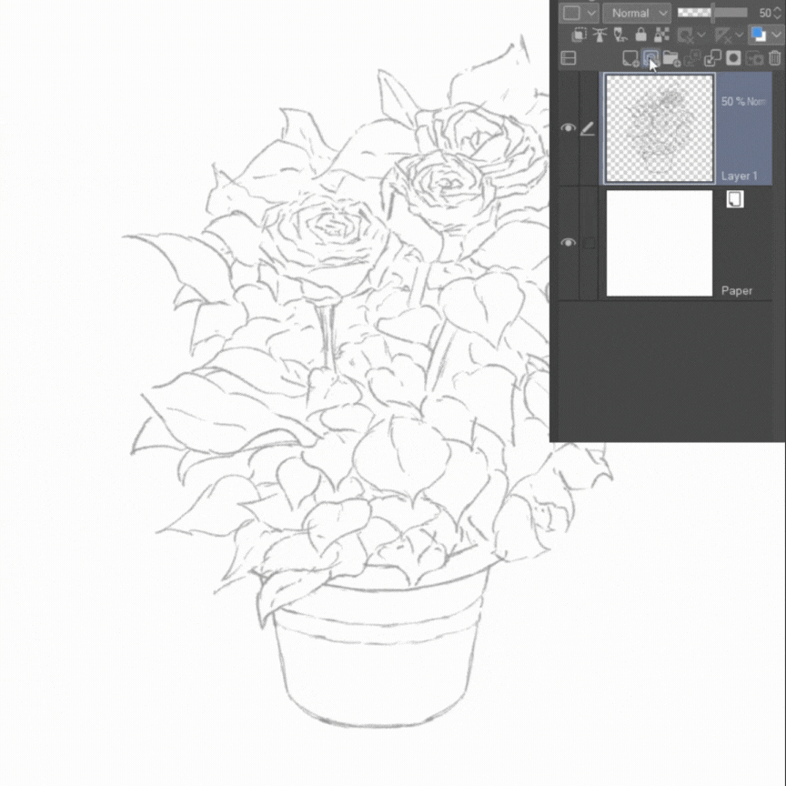 Puis j'ai baissé l'opacité du calque de croquis à 50% (ou moins) afin qu'il ne masque pas la texture de l'aquarelle plus tard.