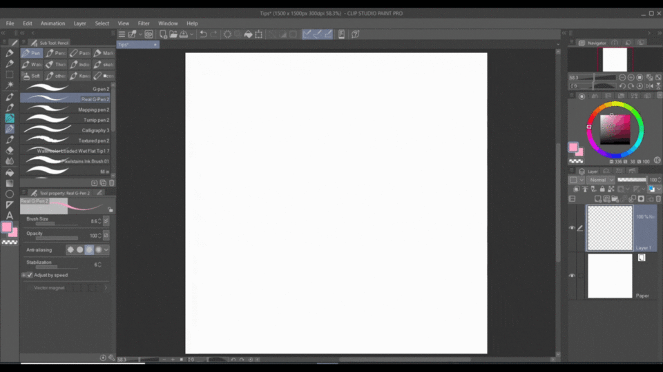 ensuite, sur un nouveau calque, j'ai utilisé le stylo par défaut de CSP (vrai stylo G) et j'ai ajouté quelques reflets (vous pouvez le trouver dans la barre d'outils ou comme je vous l'ai montré précédemment).