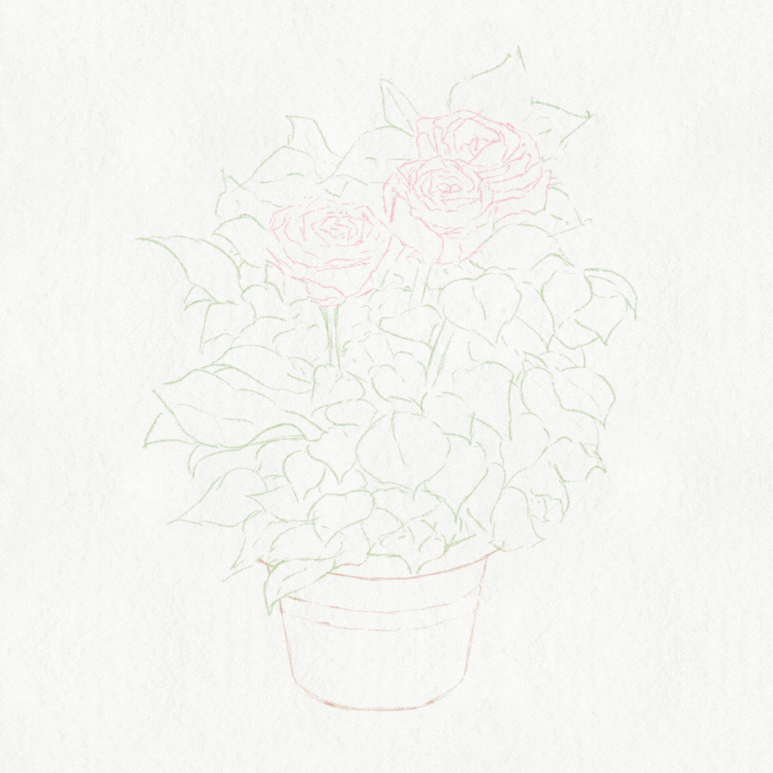 Puisque je vais dessiner une plante verte, j'ai utilisé une couleur verte pour la plante, rose pour les fleurs et marron pour le pot, afin que cela se fonde bien avec l'aquarelle que j'utiliserai plus tard.