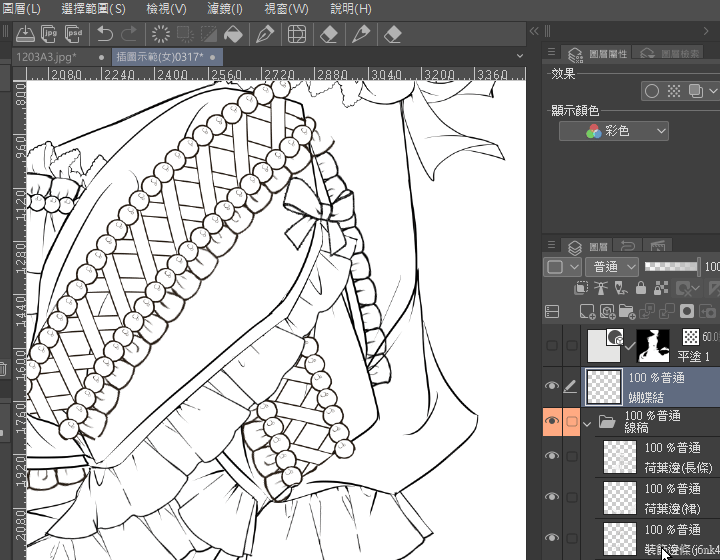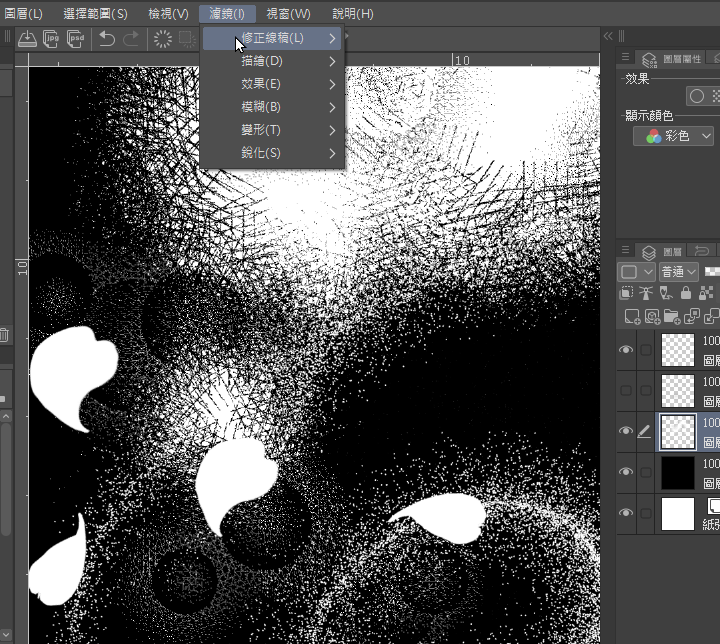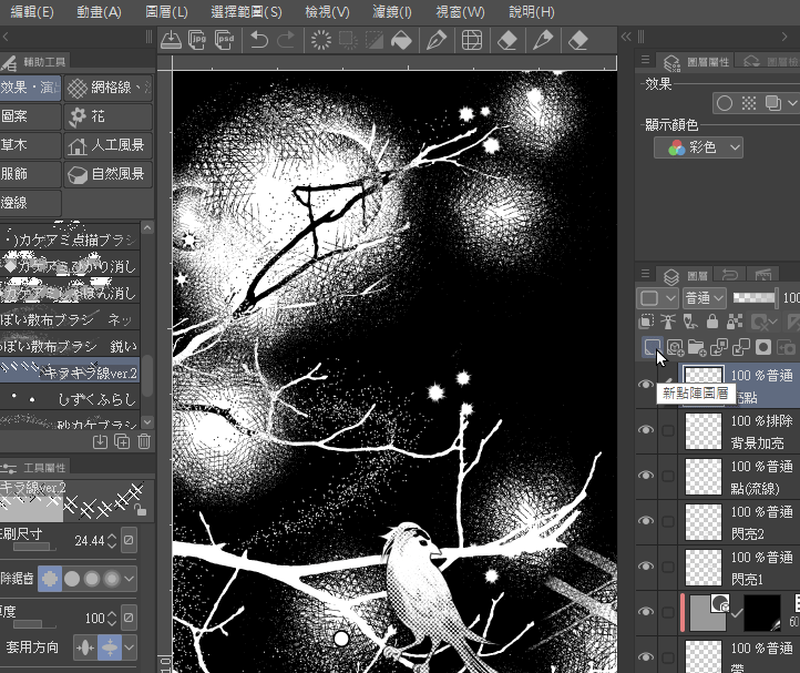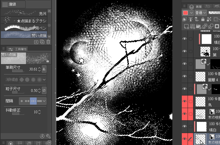 Ouvrez un nouveau calque pour la coloration et les ajouts.Sélectionnez le pinceau d'effet pointillé,dans l'exemple, choisissez le blanc pour l'utiliser comme une gomme(sur l'écran, cela donne l'impression d'effacer le noir comme une gomme,mais en fait, il est dessiné sur le calque).Cette partie permet de retoucher localement ultérieurement (déformer ou effacer de nouveau).