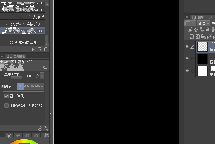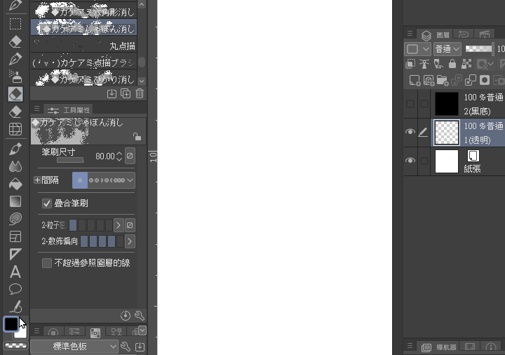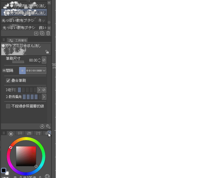 Généralement, les pinceaux d'effet peuvent directement utiliser la couleur transparente,(si le réglage intégré est en mode suppression, vous pouvez dessiner directement)pour effectuer une action d'effacement,créant ainsi une sensation de déchirure ou de transparence pour le motif.