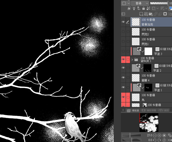 Le pinceau d'effet combiné au mode d'exclusion du calque,peut créer un style de rendu similaire à des lignes maillées dessinées à la main.Il y a un effet de dégradé de luminosité aux intersections du noir et blanc.