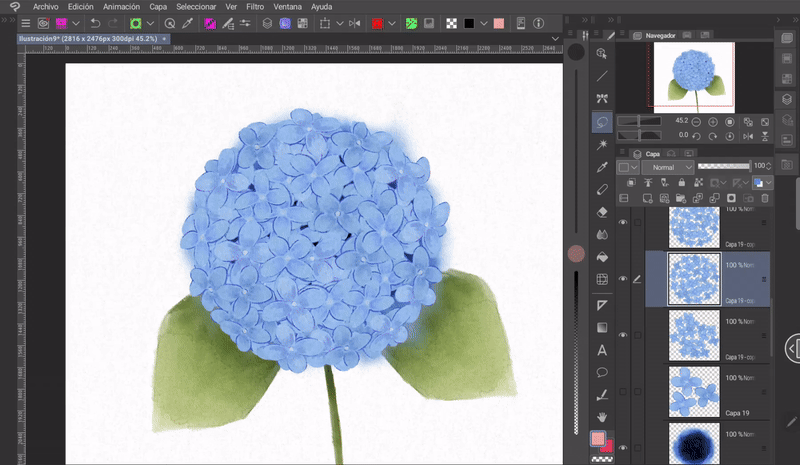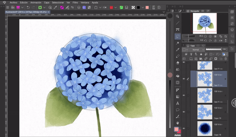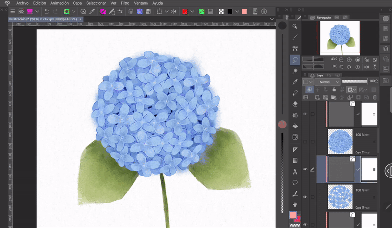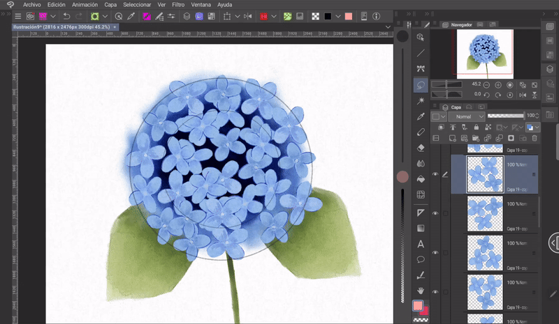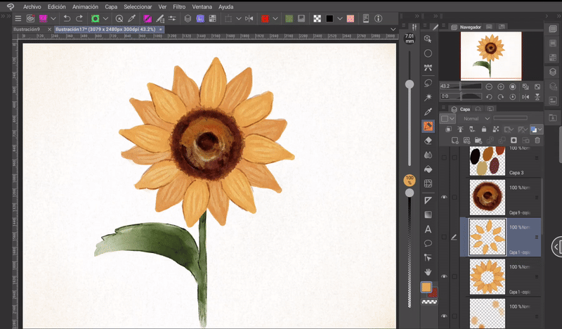 Note : Il est important de travailler avec des calques. Par exemple, pour cette fleur, j'ai fait ce qui suit : sur un calque, j'ai peint le cercle central, sur un autre les pétales, sur un autre les lumières, sur un autre les touches d'autres couleurs et enfin un pour les détails. Une fois que tout est bien en place, je les fusionne.