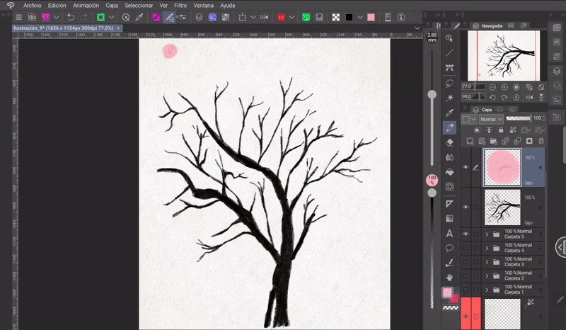 Avec le pinceau «Éclaboussure» et un ton rose clair, sur un nouveau calque au-dessus, je peins de petites taches couvrant une partie des branches. Dans les réglages du pinceau, j'ai augmenté l'intensité et le niveau de particules pour plus de confort.