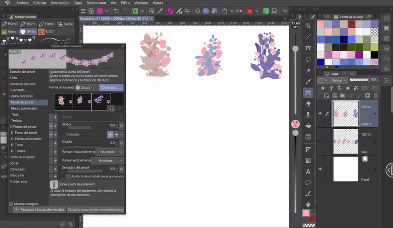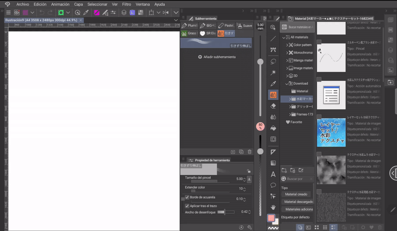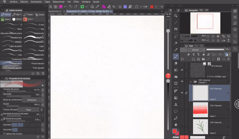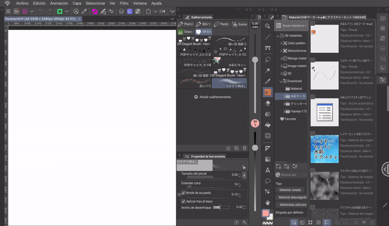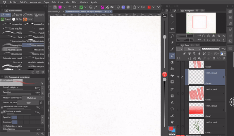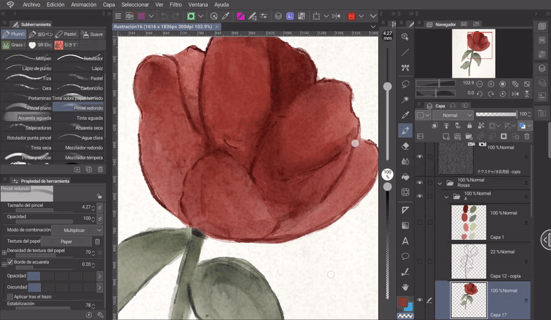 Les pinceaux aquarelle sont ceux qui présentent le plus de particularités quant à leur utilisation, mais si vous utilisez un autre type de pinceau qui imite un vrai, vous n'avez pas à vous inquiéter, leur utilisation est simple. Donc, si vous allez utiliser un autre type de pinceau, je vous conseille de faire attention à l'opacité, à la pression et au mélange.