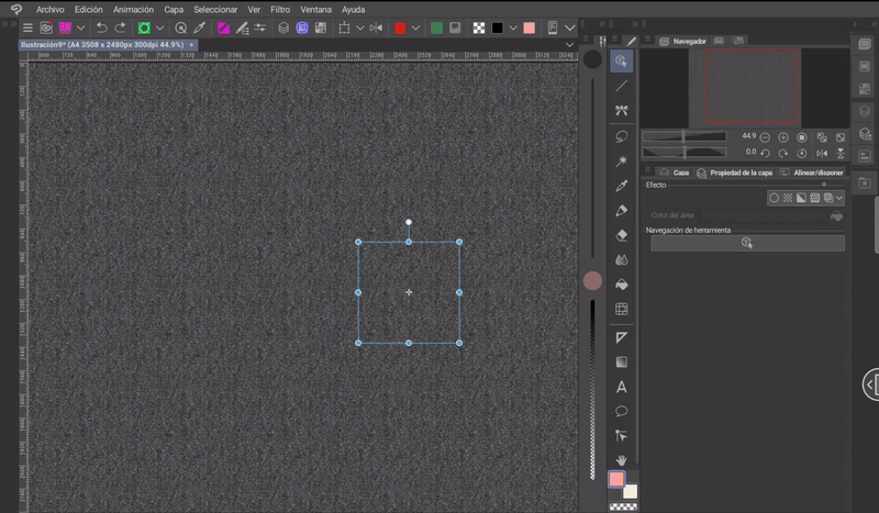 ➆ Une fois que nous avons le calque, nous le dupliquerons et le déplacerons sous l'original. Ensuite, nous le ferons pivoter avec «Transformer» comme indiqué dans le GIF.