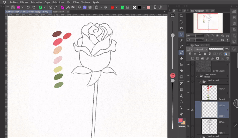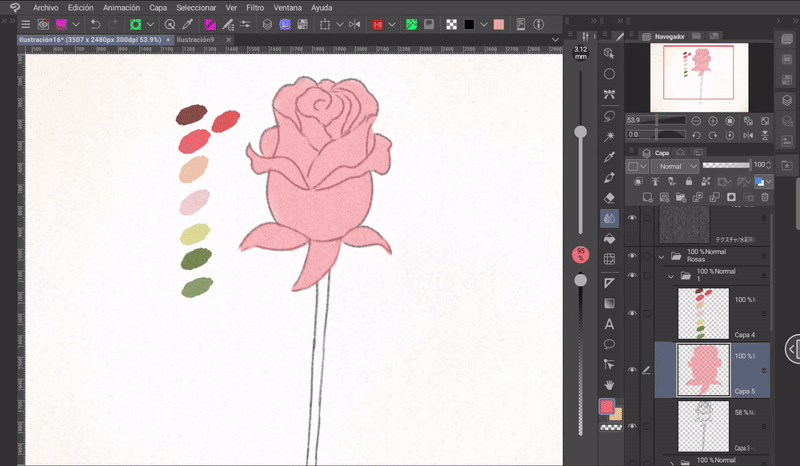 Comme pour la rose précédente, j'ai commencé par placer une couleur de base, puis, sur un nouveau calque, j'ai peint des taches qui marquent les ombres. Il faut se rappeler que les zones d'ombre se trouvent généralement entre les plis des pétales et là où la lumière ne frappe pas directement.