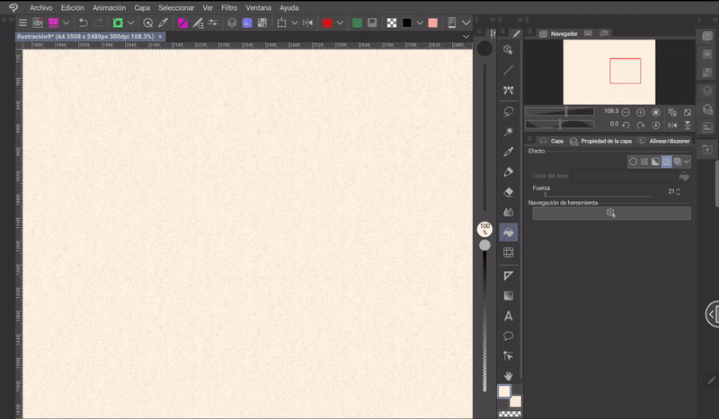 ➄ Avec cela, la texture est devenue plus visible ; nous pouvons moduler son intensité, cela se fait avec la barre de défilement «Force» de la fenêtre «Propriété du calque».