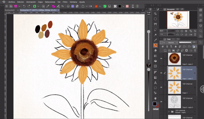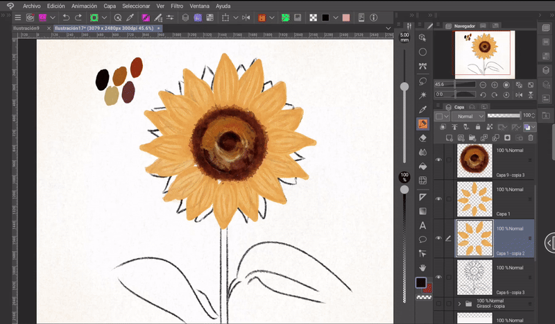 C'est au tour de peindre le centre du tournesol. Le secret de cette zone consiste à appliquer les couleurs en formant des cercles. D'abord, le cercle extérieur, celui-ci sera sombre, celui qui suit aura une teinte marron foncé, puis un autre avec une teinte plus claire jusqu'à atteindre le cercle central qui sera peint d'un marron très foncé.