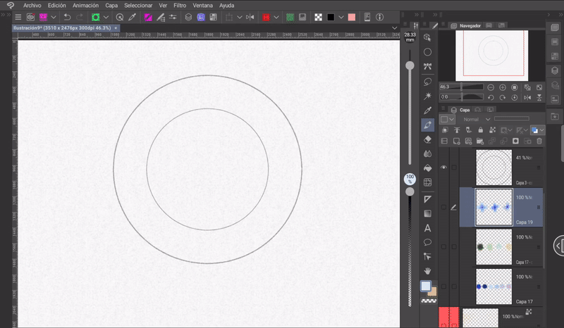 ➃ Enfin, nous dupliquerons le calque plusieurs fois et les placerons sous différents angles de manière à remplir le cercle d'une manière pas trop saturée, comme on le voit dans le GIF suivant.