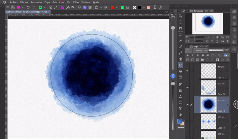 ➀ Avec le pinceau prédéfini «Éclaboussure» et une couleur bleue assez claire, nous commencerons par peindre délicatement le cercle extérieur, puis nous peindrons un petit cercle intérieur plus foncé par rapport au précédent et enfin nous remplirons le cercle intérieur avec un bleu profond que nous obtiendrons en repassant plusieurs fois la zone avec le même pinceau.
