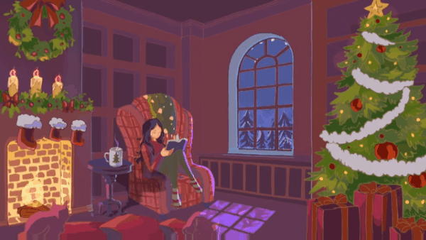 En hiver, alors que tout est très sombre et flou dehors à cause de la neige et que presque toutes les plantes meurent, quelqu'un [[peut-être vous ou moi]] profite d'un moment de lecture dans un foyer douillet avec de petits compagnons.