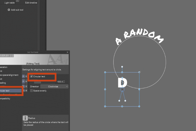 En cochant Texte circulaire dans l'onglet du même nom de la palette Détail de l'outil secondaire, la ligne de base du texte se transforme en cercle. En utilisant les poignées, vous pouvez modifier la taille du cercle et déplacer le texte autour de celui-ci.