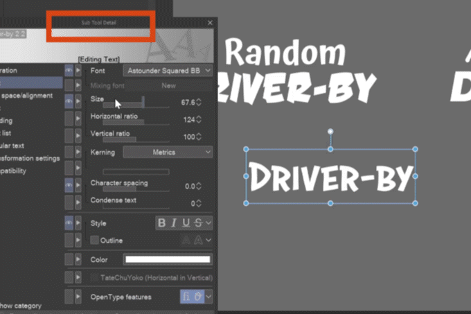 Avec l'outil Opération, en plus de transformer le texte avec des poignées, vous pouvez redimensionner le texte dans la palette Détail de l'outil secondaire dans l'onglet Police > Échelle, Ratio horizontal et vertical, et faire pivoter et incliner le texte dans l'onglet Paramètres de transformation.