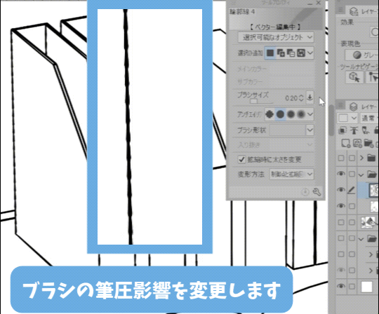 ▲ Pour mieux visualiser les variations d'épaisseur, la taille du pinceau est réglée sur 0,2 mm.