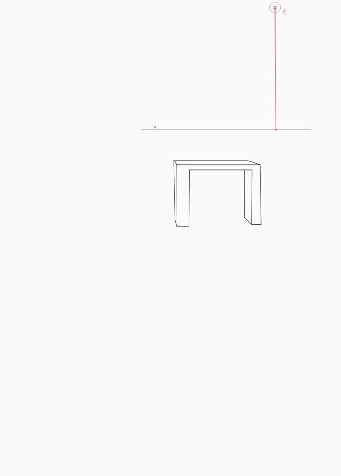 Comme dans le GIF (lumière), représenté par des lignes rouges : un point lumineux (V) en haut et un autre point lumineux (V) sur la ligne horizontale située juste en dessous. En direction d'une des lignes verticales de l'objet, le point lumineux supérieur (V) utilise une ligne noire tracée le long du sommet d'une ligne verticale visible de l'objet. Ensuite, le point lumineux inférieur (V) utilise une ligne rouge tracée le long de la base de la même ligne verticale visible de l'objet. Étendez les lignes supérieure et inférieure jusqu'à ce qu'elles se croisent, créant de nouveaux (points). (Ceci est fait pour chaque ensemble de lignes verticales d'objets.) Cela permet de déterminer approximativement la position des ombres.