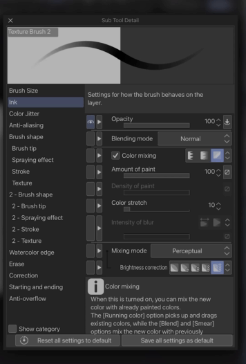 Le seul autre paramètre que je mentionnerais pour les pinceaux est le mélange de couleurs perceptuel. C'est facultatif, mais je recommande fortement de l'activer pour la plupart de vos pinceaux pour un meilleur mélange de nuances plus naturel. Cela sera utile pour les étapes ultérieures lorsque nous commencerons à travailler avec la couleur.