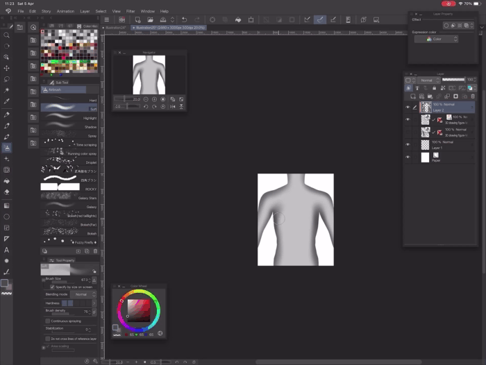 Créez un nouveau calque au-dessus de la silhouette du corps et activez « Masque d'écrêtage » (Clip to layer below) afin que le contenu du nouveau calque ne s'affiche que dans la silhouette.