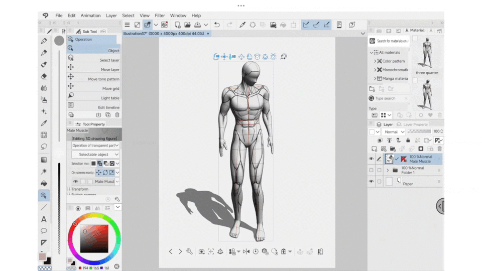 Si vous souhaitez des structures musculaires encore plus détaillées dans vos dessins, j'ai trouvé une ressource 3D vraiment géniale qui possède déjà des détails musculaires dessinés ! À partir de maintenant, j'utiliserai cette ressource comme guide, d'autant plus que je veux mettre en évidence certains groupes musculaires plus petits et plus détaillés.\ Mais ne vous inquiétez pas ! Que vous utilisiez ce modèle détaillé ou que vous vous en teniez à la figure 3D de base, le processus étape par étape restera exactement le même. Alors, n'hésitez pas à suivre comme vous le souhaitez !