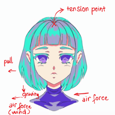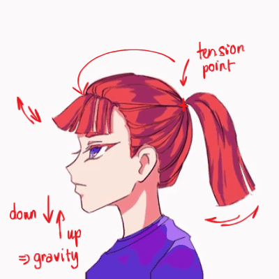 Selon leur position et leur longueur, les cheveux bougeront différemment.\n>\n> Plus ils sont longs, plus ils sont lourds > beaucoup affectés par la gravité > beaucoup de retard > plus lents > nécessitent plus d'images pour représenter le mouvement et vice-versa\n>\n> Les parties proches des points de tension[ ligne des cheveux, raie ou tourbillon de cheveux] ont une faible amplitude de mouvement.