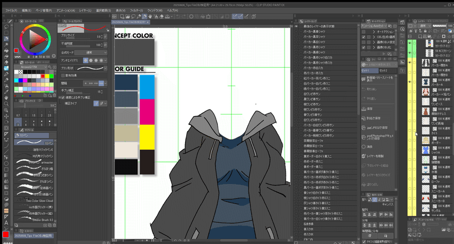 Si vous intégrez des guides de couleurs lors de l'enregistrement de la liste de compositions de calques selon l'utilisation, cela est utile car cela facilite immédiatement la collaboration, la visibilité intuitive de la coordination des couleurs de personnages et l'extraction des couleurs.