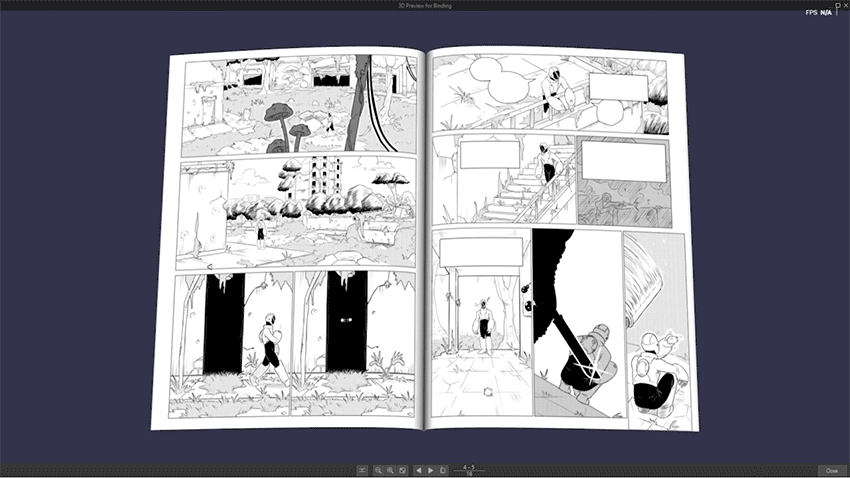 Cette fonctionnalité génère un aperçu 3D de l'apparence de votre bande dessinée si elle était imprimée, basé sur les [Paramètres de bande dessinée] que vous avez configurés précédemment. C'est un outil très utile pour s'assurer que votre œuvre reste dans la zone de sécurité et que rien ne se perde trop près du dos de la bande dessinée.