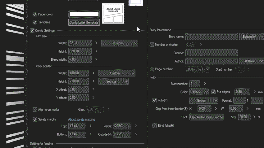 La deuxième section est [Paramètres de bande dessinée], où vous trouverez toutes les options liées à la zone de dessin et à la zone de rognage de votre bande dessinée.