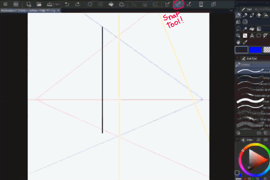 Une fois que vous avez une règle de perspective sur votre toile, c'est comme un aimant pour vos pinceaux et stylos. Tant que l'option "Magnétisme sur règle spéciale" est activée (c'est une petite icône d'aimant dans la barre de commandes), vos lignes suivront automatiquement les lignes de perspective, créant des lignes parfaitement droites qui mènent à vos points de fuite.