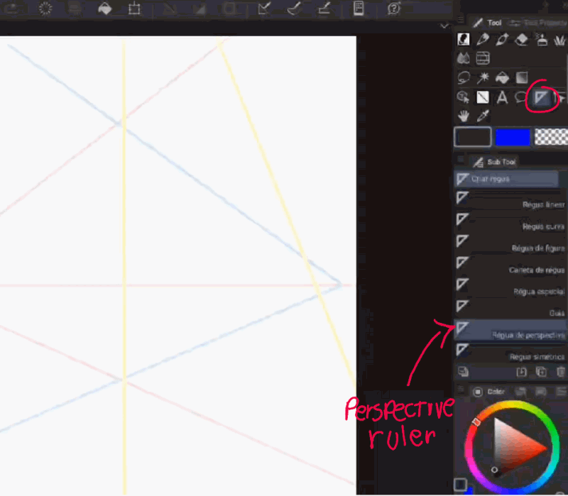 Vous pouvez également créer manuellement une règle en sélectionnant le sous-outil "Règle de perspective" et en plaçant deux règles pour créer une ligne d'horizon, ce qui vous donne plus de contrôle pour dessiner vos guides.