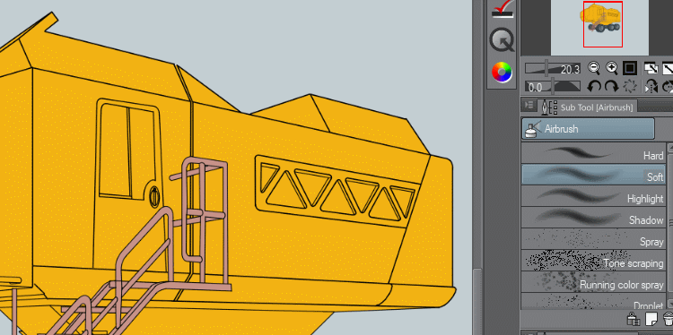 Ce sont les ombres que je crée pour le véhicule, rien de trop compliqué, juste une séparation de plans qui aide à marquer les volumes.