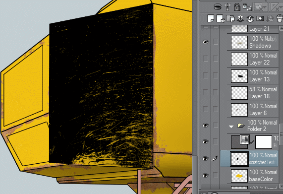 Sous la couleur de base se trouve la texture de rouille ; nous devons commencer à sculpter la couleur jaune pour révéler la rouille, pour cela j'ai utilisé un pinceau texturé.