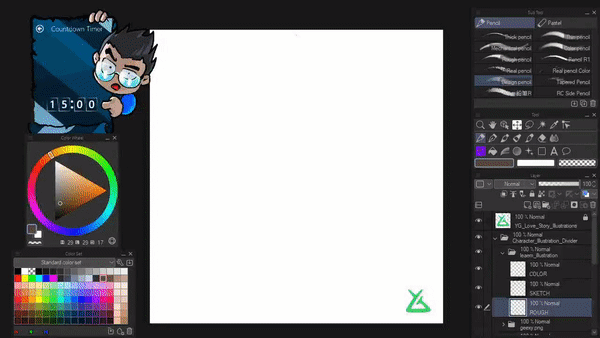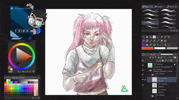 III. Coloration rapide avec 【 Dégradé doux 】 + 【 Lavis rugueux 】 du 【 Pinceau Aquarelle Réaliste 】 pendant environ 12 minutes. J'aime l'idée que cela ressemble à un crayon de couleur plutôt qu'à de l'aqurelle, trop douce pour un personnage aussi énergique. Ensuite, j'ajoute des détails avec 【 Plume effilée 】 pour certaines parties détaillées comme le visage et les cheveux.