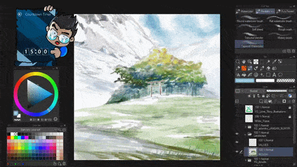 De même que pour les arbres, afin de créer des buissons avec un seul pinceau ; je suggère de pratiquer la pression de votre stylet et le contrôle chaque fois que vous décidez d'utiliser le 【 Lavis rugueux 】 avec une palette de couleurs limitée, comme je vous le montre avec le GIF. Puis, après que vous pensiez que c'est suffisant pour avoir les tons sombres, moyens et clairs ; vous pouvez essayer de jouer avec la 【 Teinte 】 pour obtenir les couleurs que vous souhaitez.