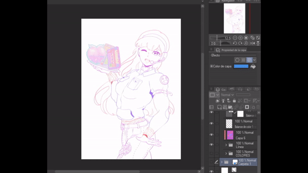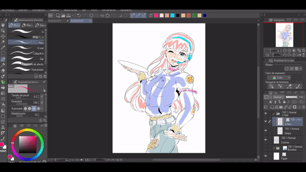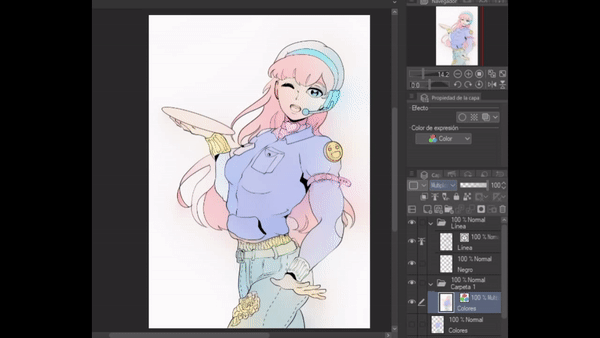 Le calque de lignes était en noir, mais vous pouvez changer les couleurs des lignes si vous ne les aimez pas en noir. Par exemple, j'ai placé un calque supérieur, je l'ai ajusté pour qu'il n'affecte que les lignes et les ombres de mon dossier “Ligne” et j'ai utilisé des couleurs pastel pour peindre certaines parties de mon illustration.