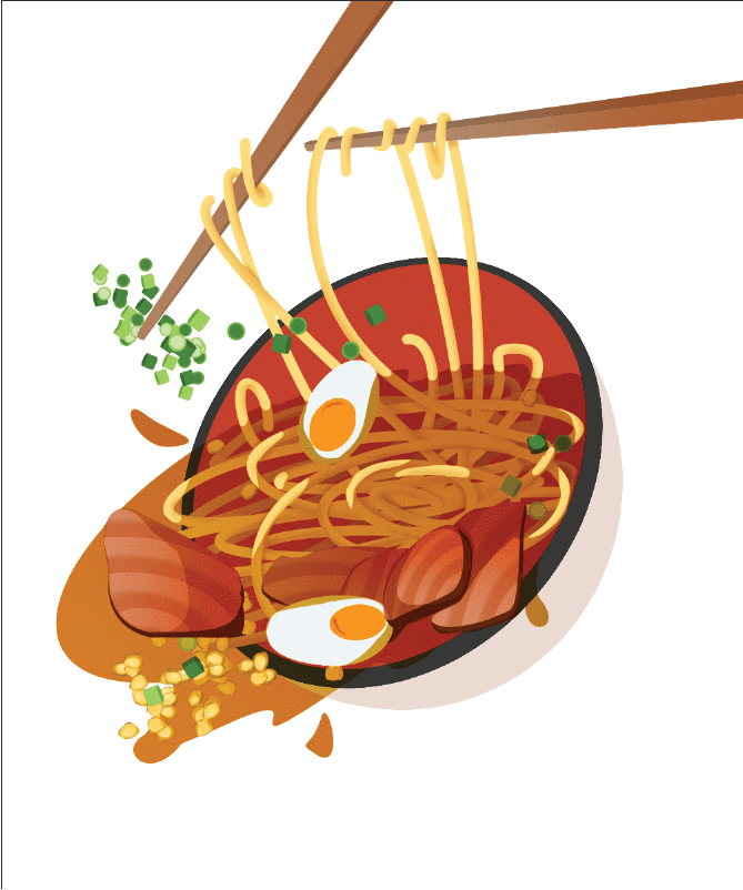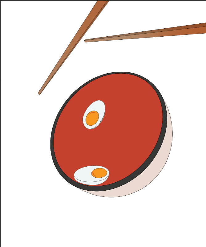 J'ai fait cela pour chaque élément (sauf les nouilles, bien sûr), en coloriant avec des couleurs unies ou des dégradés, et en ajoutant des détails comme je le souhaitais. J'ai conservé le trait dans cette section à des fins d'illustration, mais désactivez les calques au fur et à mesure que vous les parcourez.