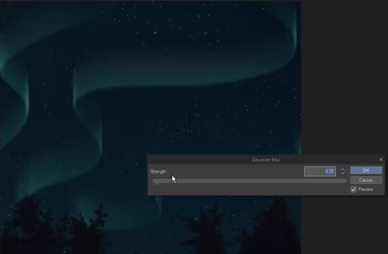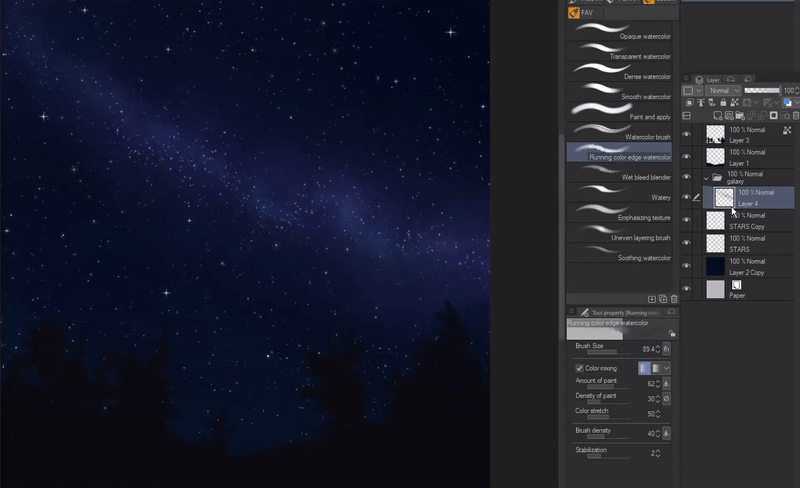 Pour donner aux étoiles une lueur diffuse autour d'elles, j'ai utilisé cette fonctionnalité vraiment étonnante de Clip Studio Paint appelée [Effet de bordure] dans le panneau des propriétés de calque. L'effet [Bordure] donne à tout votre calque une bordure solide de n'importe quelle couleur autour de lui, tandis que l'[Bordure aquarelle] donne à votre calque une bordure diffuse de la couleur de votre calque autour de lui. Lorsque vous l'utilisez pour les étoiles, cela donne un très bel effet de lueur lorsque vous expérimentez avec les réglages.