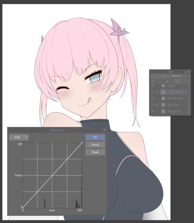 Créez un nouveau calque de correction de courbe de tonalité ( Calque > Nouveau calque de correction > Courbe de tonalité... ) entre le calque du lineart et le calque de la couleur de base.