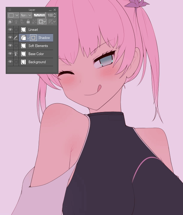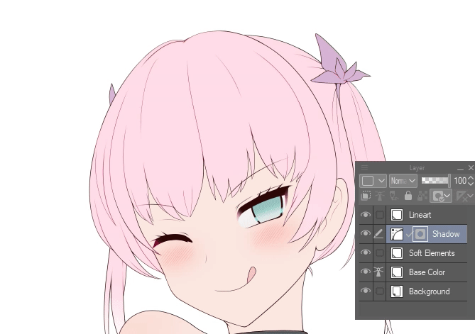Ce qui constitue une "illustration prête pour l'ombrage" varie, mais pour les besoins de cette technique, il s'agit du lineart sur un calque et des couleurs de base (tons moyens) sur un autre calque.