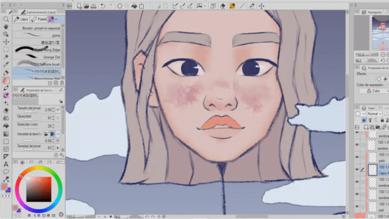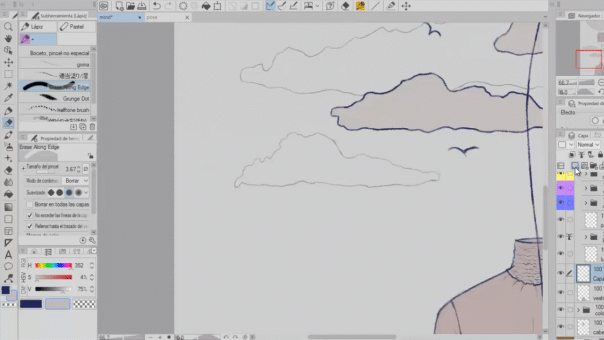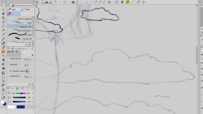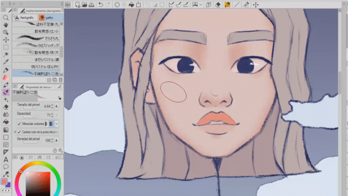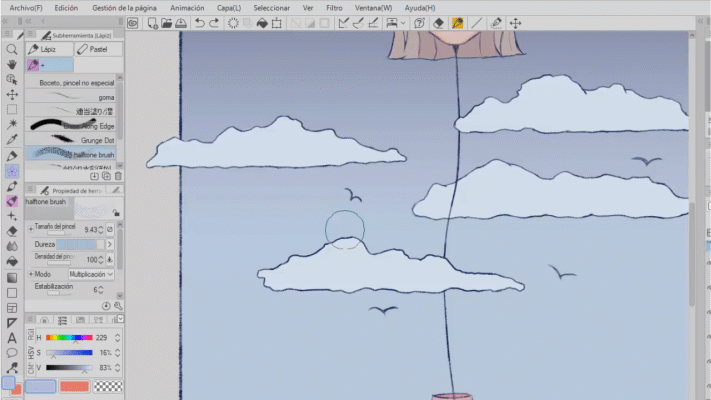 Ce pinceau est l'un de mes préférés, il a une texture ou un motif à points. J'aime la touche qu'il donne au dessin, dans ce cas, je l'ai utilisé sur les nuages et comme vous pouvez le voir, j'ai estompé avec le pinceau mentionné ci-dessus.
