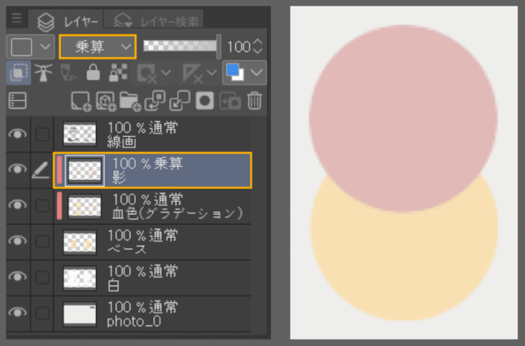 Maintenant, essayons de peindre les ombres sur la peau.Créez un autre « Calque d'écrêtage » et changez le mode de fusion du calque en « Produit » (Multiplication). Les couleurs peintes sur un « Calque en mode Produit » se superposent toujours sur le calque inférieur, ce qui facilite grandement la peinture des ombres.