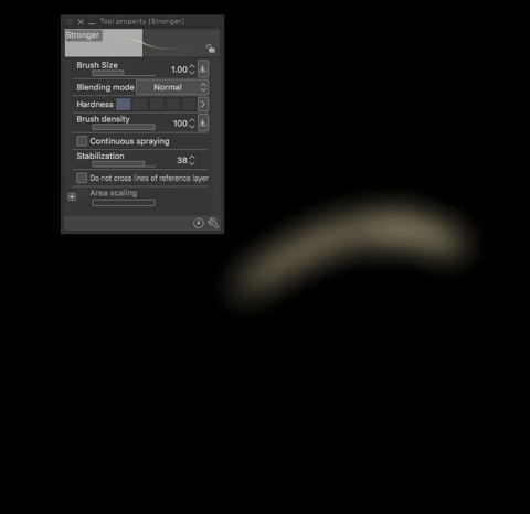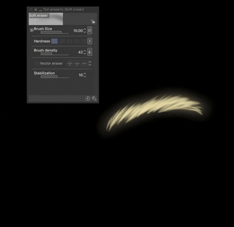 J'utilise le pinceau Soft Line/Sketch/Color de Fardros qui crée un effet de cheveux sympa. Vous pouvez le télécharger via le lien ci-dessous. Réglez le pinceau à une taille : 3.00, opacité : 100 %, densité de peinture : 49, anti-aliasing : fort, dureté : 1 et effilement : 5. Utilisez un jaune foncé : Hex : E3C289. Ci-dessous se trouve un exemple de comment créer les cheveux.