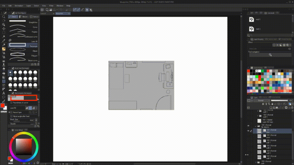 La première chose à faire est de créer une archive avec tous les plans de la pièce que nous allons dessiner. Elle contiendra les plans du sol et des murs (dans cet exemple, je n'ai pas trouvé nécessaire d'en ajouter un pour le plafond). Chacun d'eux sera un rectangle séparé dans un calque séparé.
