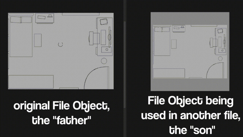 effectuez les modifications nécessaires, enregistrez, et si l'Objet-fichier « fils » ouvert dans un autre projet ne se met pas à jour automatiquement, allez sur son calque, faites un clic droit et allez dans [Objet-fichier (X)] > [Mettre à jour l'objet-fichier].