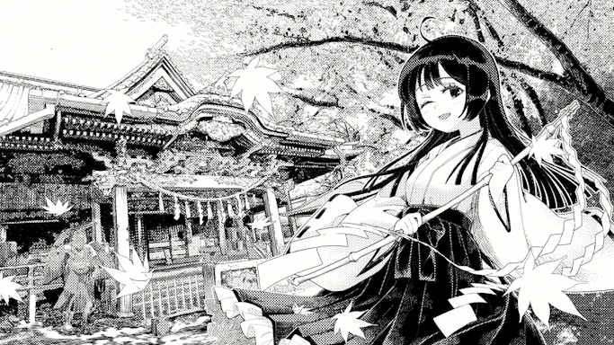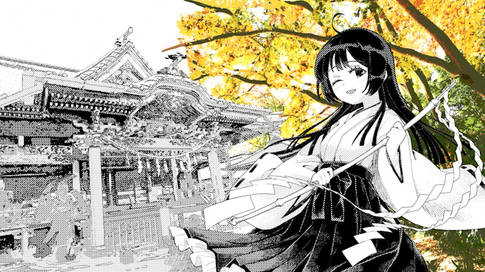 Cette fois, je vais dessiner le fond derrière ce personnage de miko en utilisant ces deux photos que j'ai prises avec mon smartphone. Ce sont des photos d'un sanctuaire et de feuilles d'automne.