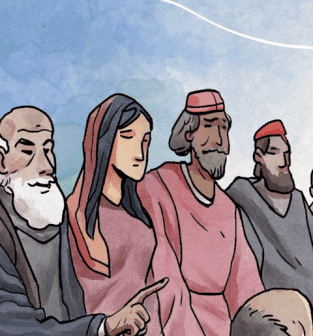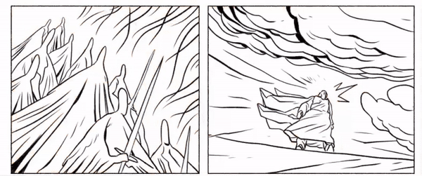 Ensuite, en pensant à une lumière venant d'une direction des personnages, j'ai dessiné des lumières sur les côtés des objets, et une lumière de contour entourant totalement la figure principale de l'illustration (Jésus) :